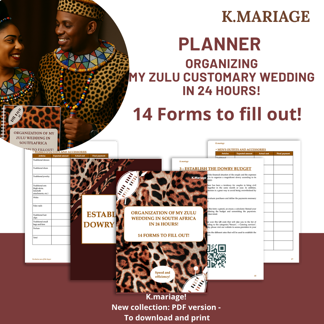 Un guide structuré et pratique avec 14 fiches prêtes à remplir, conçu pour organiser votre cérémonie de mariage coutumier Zulu en seulement 24 heures. Que vous soyez la future mariée, un membre du comité ou un proche impliqué dans l’organisation, ce livre vous accompagne étape par étape.