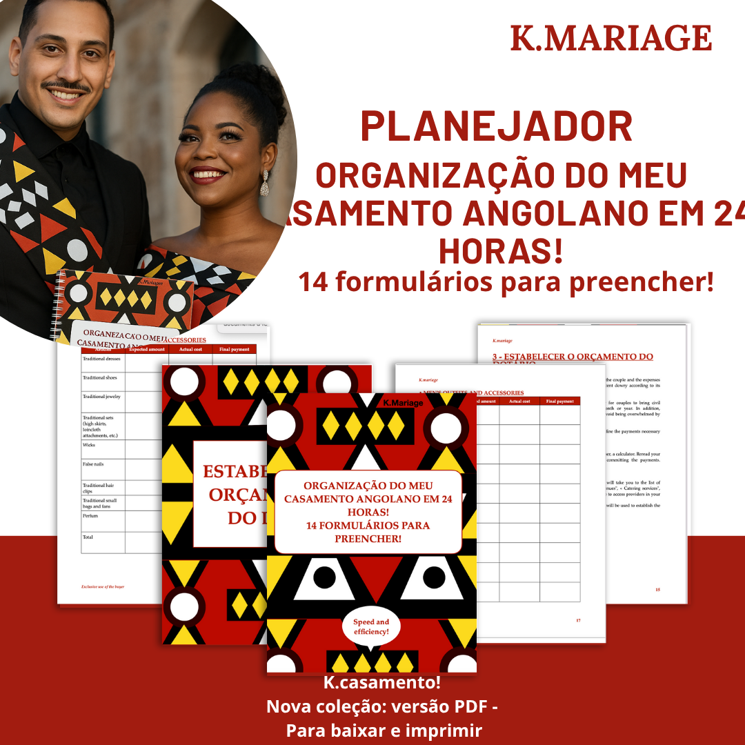 Un guide structuré et pratique avec 14 fiches prêtes à remplir, conçu pour organiser votre cérémonie de mariage coutumier Angolais en seulement 24 heures. Que vous soyez la future mariée, un membre du comité ou un proche impliqué dans l’organisation, ce livre vous accompagne étape par étape.