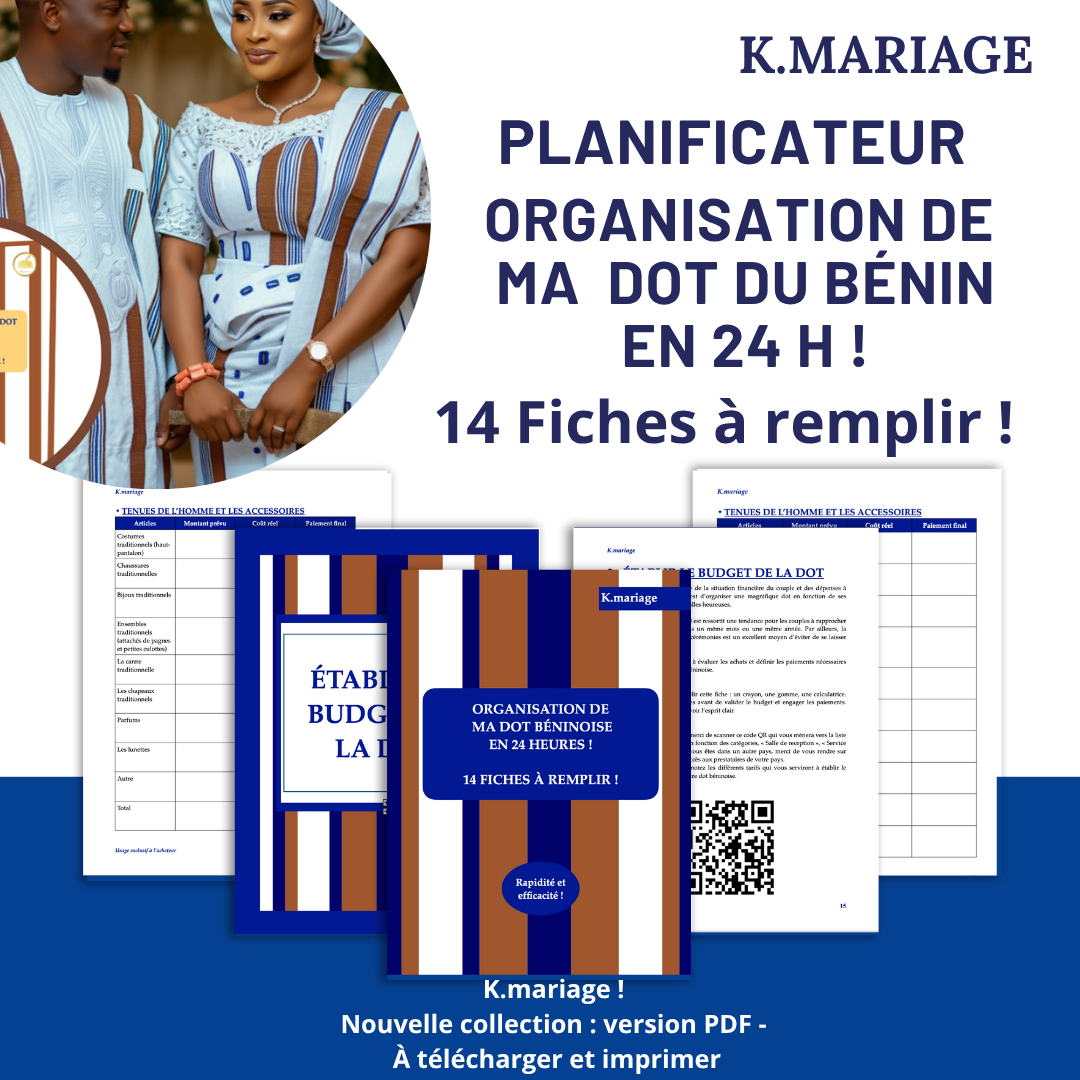 Un guide structuré et pratique avec 14 fiches prêtes à remplir, conçu pour organiser votre cérémonie de dot Béninoise en seulement 24 heures. Que vous soyez la future mariée, un membre du comité ou un proche impliqué dans l’organisation, ce livre vous accompagne étape par étape.