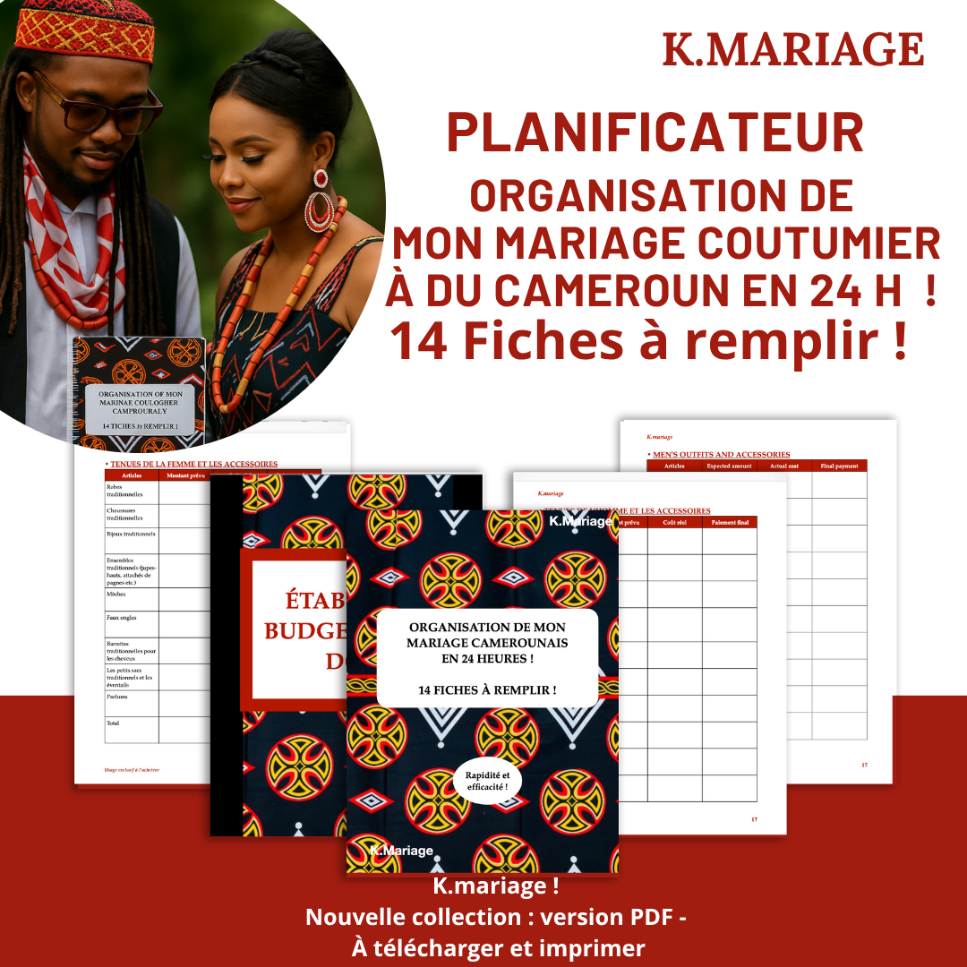 Un guide structuré et pratique avec 14 fiches prêtes à remplir, conçu pour organiser votre cérémonie de mariage coutumier camerounais en seulement 24 heures. Que vous soyez la future mariée, un membre du comité ou un proche impliqué dans l’organisation, ce livre vous accompagne étape par étape.