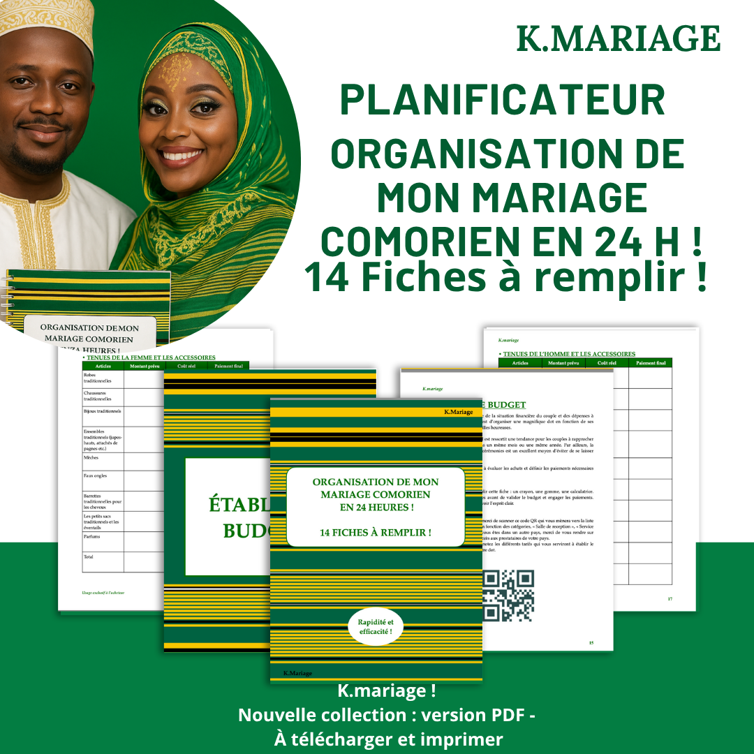 Un guide structuré et pratique avec 14 fiches prêtes à remplir, conçu pour organiser votre cérémonie de mariage coutumier Comorien en seulement 24 heures. Que vous soyez la future mariée, un membre du comité ou un proche impliqué dans l’organisation, ce livre vous accompagne étape par étape.