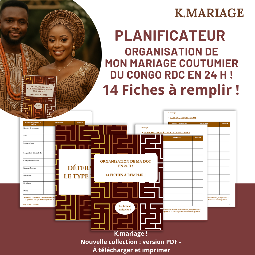 Un guide structuré et pratique avec 14 fiches prêtes à remplir, conçu pour organiser votre cérémonie de mariage coutumier Congolais en seulement 24 heures. Que vous soyez la future mariée, un membre du comité ou un proche impliqué dans l’organisation, ce livre vous accompagne étape par étape.
