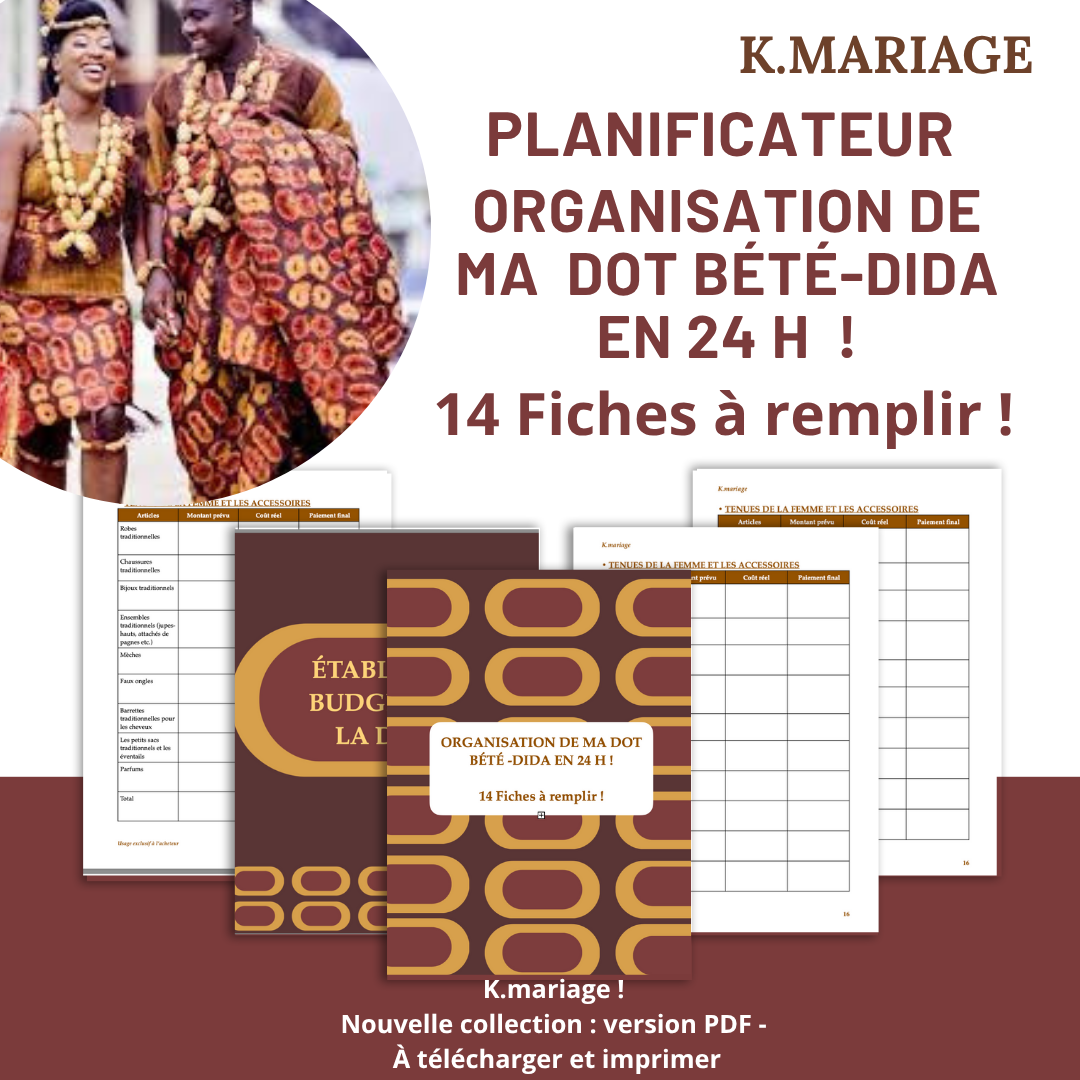 Un guide structuré et pratique avec 14 fiches prêtes à remplir, conçu pour organiser votre cérémonie de dot Bété-Dida en seulement 24 heures. Que vous soyez la future mariée, un membre du comité ou un proche impliqué dans l’organisation, ce livre vous accompagne étape par étape.