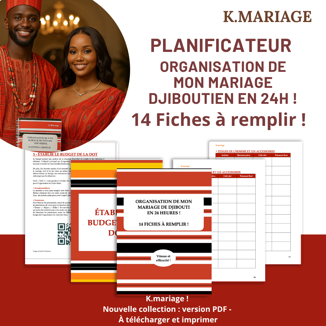 Un guide structuré et pratique avec 14 fiches prêtes à remplir, conçu pour organiser votre cérémonie de mariage coutumier Djiboutien en seulement 24 heures. Que vous soyez la future mariée, un membre du comité ou un proche impliqué dans l’organisation, ce livre vous accompagne étape par étape.
