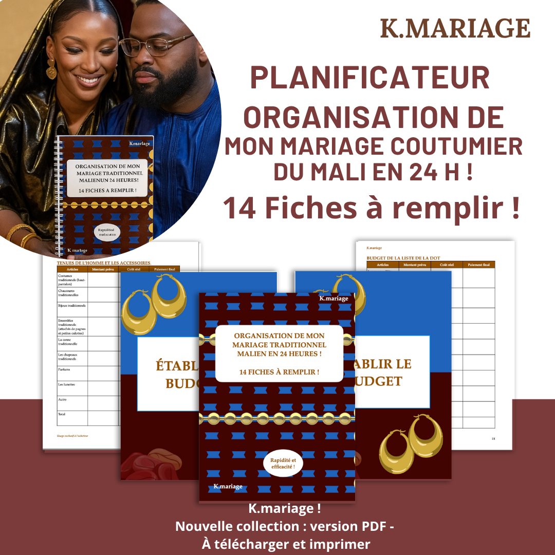 Un guide structuré et pratique avec 14 fiches prêtes à remplir, conçu pour organiser votre cérémonie de mariage malien du en seulement 24 heures. Que vous soyez la future mariée, un membre du comité ou un proche impliqué dans l’organisation, ce livre vous accompagne étape par étape.