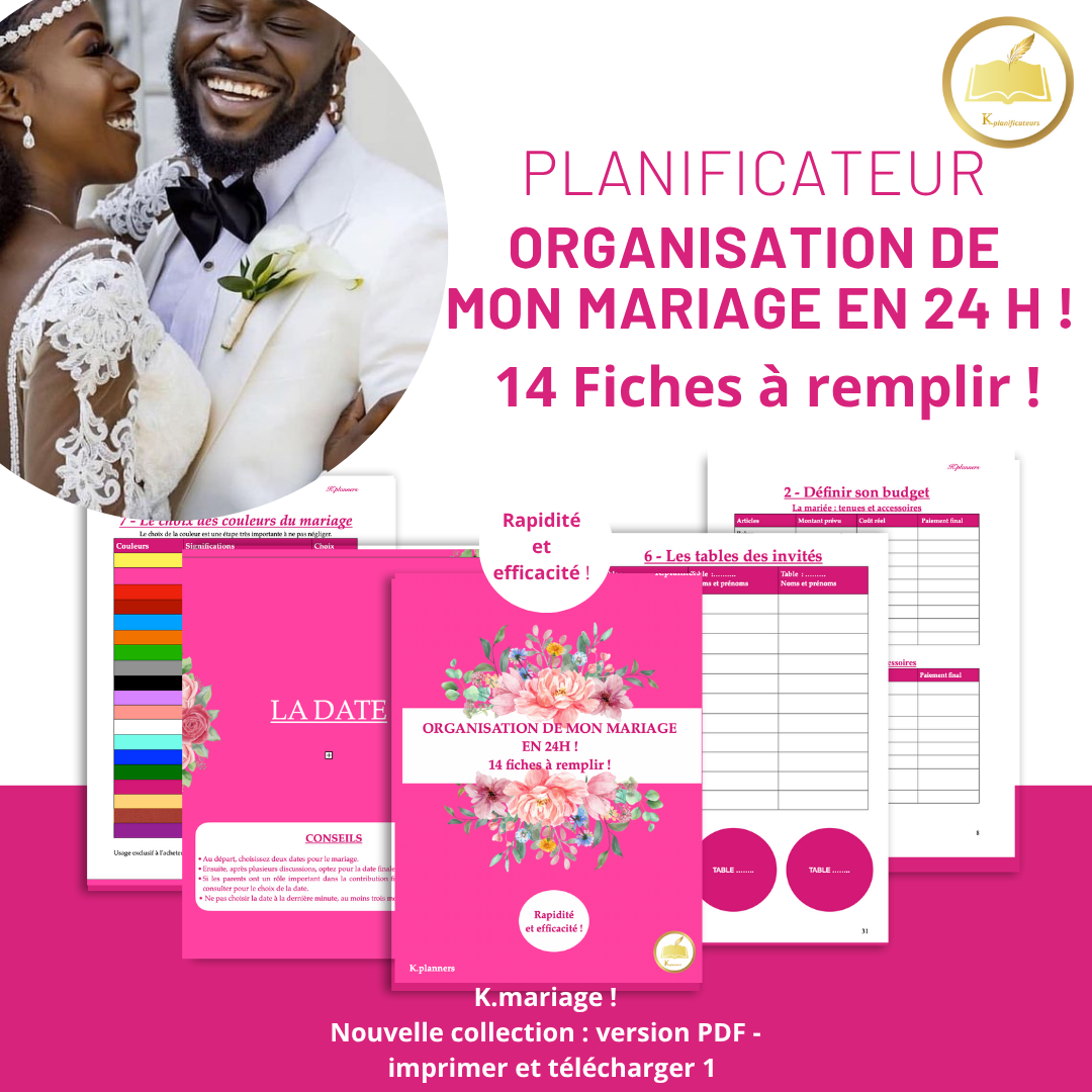 Le concept ? Un planificateur structuré et prêt à l’emploi, contenant 14 fiches pratiques à remplir, conçu pour vous aider à organiser votre mariage civil ou coutumier en toute sérénité, même en dernière minute.