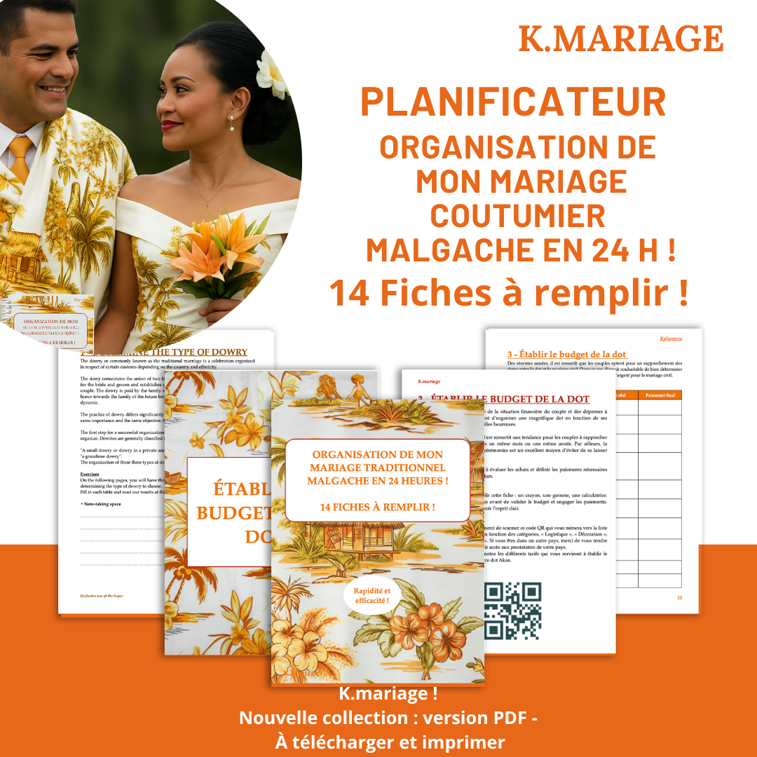 Un guide structuré et pratique avec 14 fiches prêtes à remplir, conçu pour organiser votre cérémonie de mariage coutumier Malgache en seulement 24 heures. Que vous soyez la future mariée, un membre du comité ou un proche impliqué dans l’organisation, ce livre vous accompagne étape par étape.