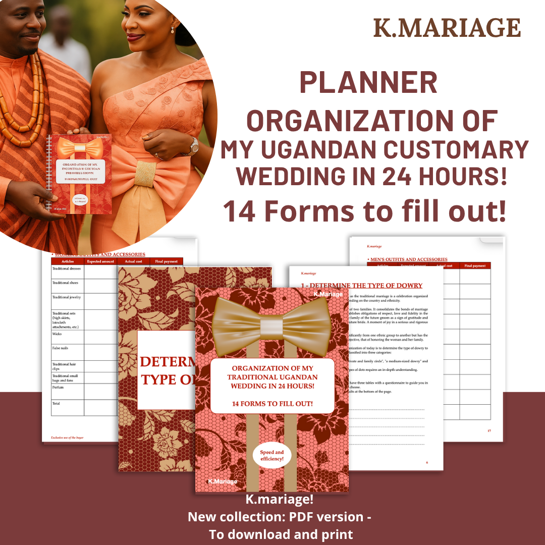 Un guide structuré et pratique avec 14 fiches prêtes à remplir, conçu pour organiser votre cérémonie de mariage coutumier Ougandais en seulement 24 heures. Que vous soyez la future mariée, un membre du comité ou un proche impliqué dans l’organisation, ce livre vous accompagne étape par étape.