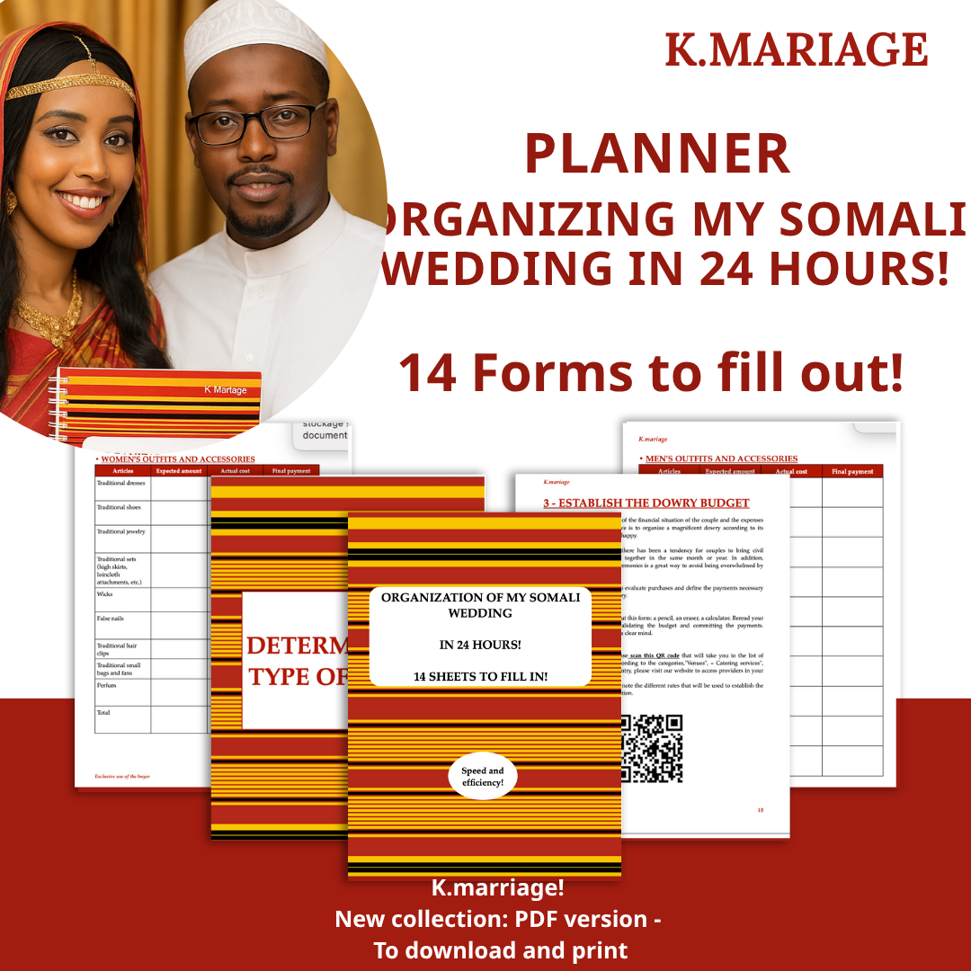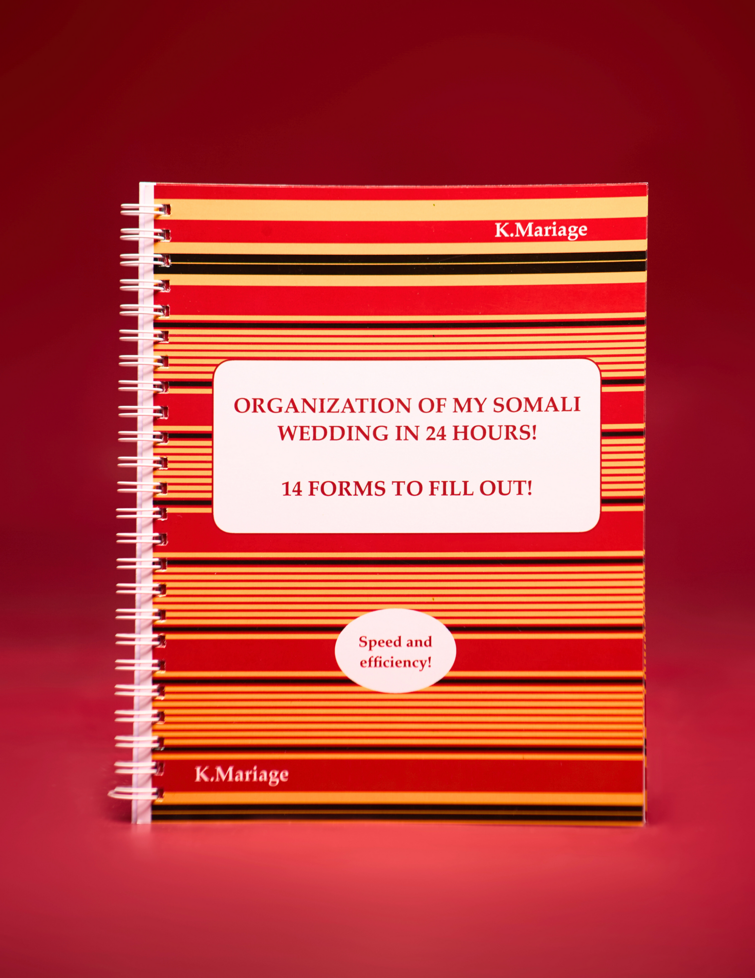 Un guide structuré et pratique avec 14 fiches prêtes à remplir, conçu pour organiser votre cérémonie de mariage coutumier Somalien en seulement 24 heures. Que vous soyez la future mariée, un membre du comité ou un proche impliqué dans l’organisation, ce livre vous accompagne étape par étape.